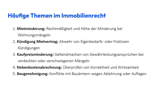 Ob Sie kaufen, mieten, vermieten oder verkaufen – mit einem erfahrenen Anwalt für Immobilienrecht an Ihrer Seite sind Sie auf der sichere Seite. staranwalt-immobilienrecht.de bietet Ihnen rechtliche Klarheit, wirtschaftliche Sicherheit und professionelle Vertretung in allen Lebenslagen rund ums Wohnen und Investieren.